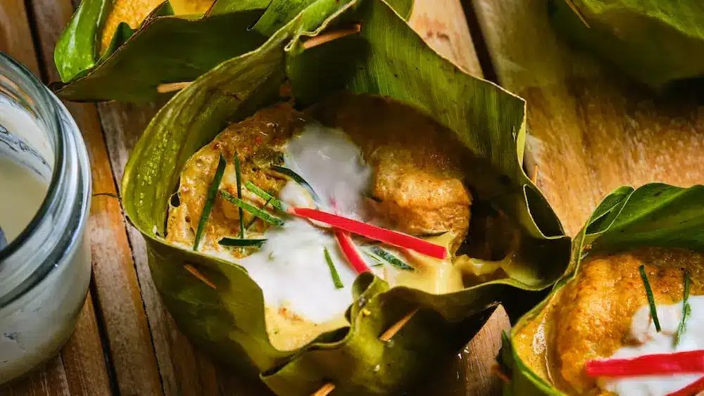 - Amok : Un plato de pescado al vapor en una crema de coco y curry, servido en hojas de plátano.